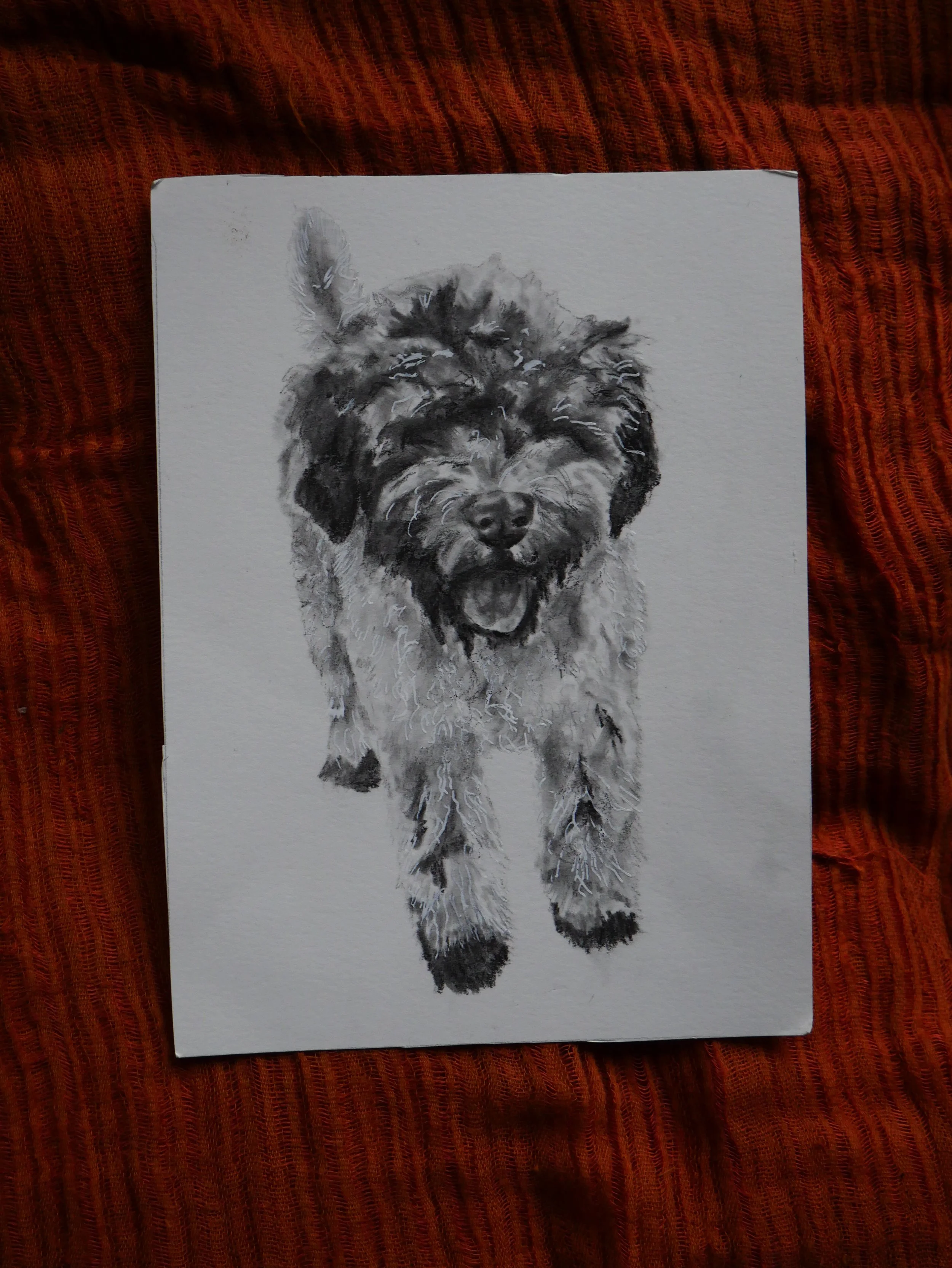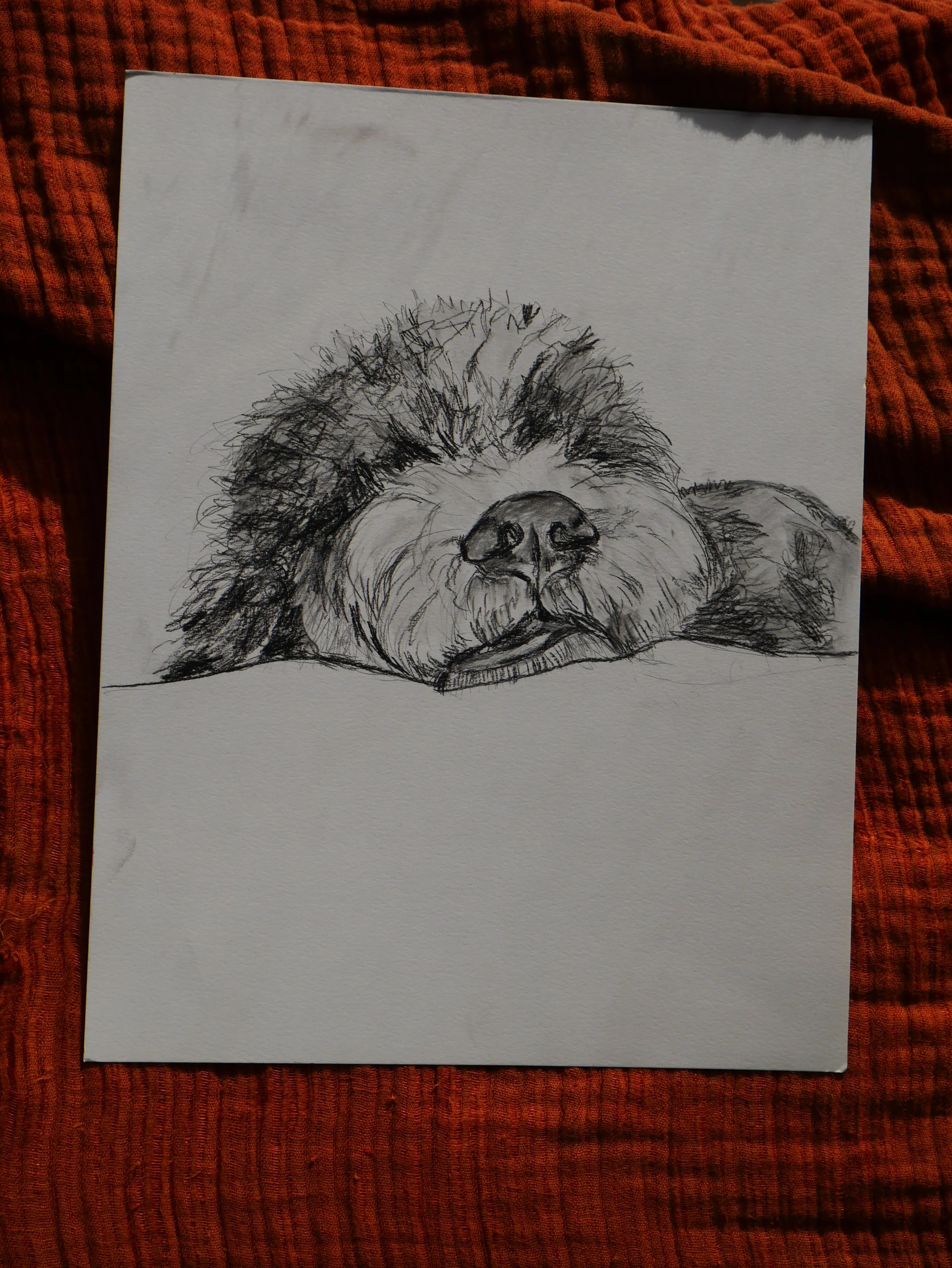 I find a lot of freedom with pencil and charcoal. Dogs, in particularm are a forgiving subject with their crazy curls and ever changing tails.
